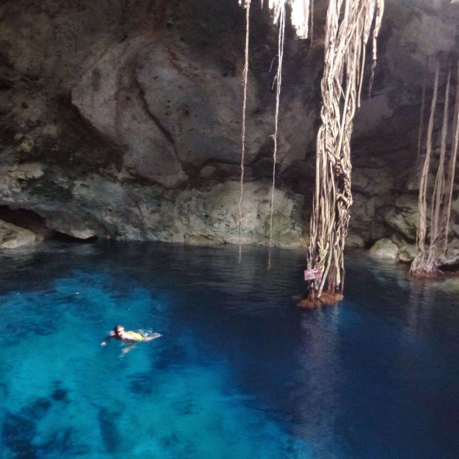 This is the entrance to the first cave/cenote. To get to the cave, we climbed down the tree roots to a homemade ladder. The cenote was more like an underground river. The only light came from the guide's flashlight. He was a very important man to us! What an adventure.